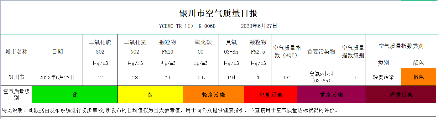 2023年6月27日银川市环境空气质量指数(AQI)为131,三级,轻度污染,首要污染物为臭氧8小时(03_8h),臭氧浓度为194μg/m3。