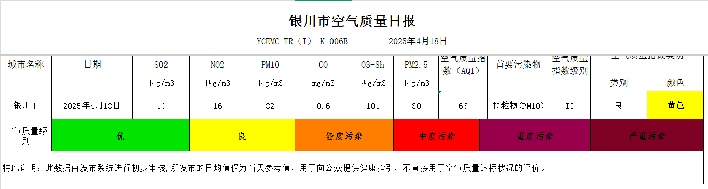 2025年4月18日银川市环境空气质量指数(AQI)为66, 二级,良,首要污染物为颗粒物(PM10),PM10浓度82μg/m3。