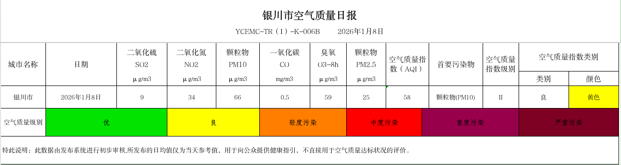 2026年1月8日银川市环境空气质量指数(AQI)为58,二级,良,首要污染物为颗粒物(PM10),PM10浓度为66μg/m3。