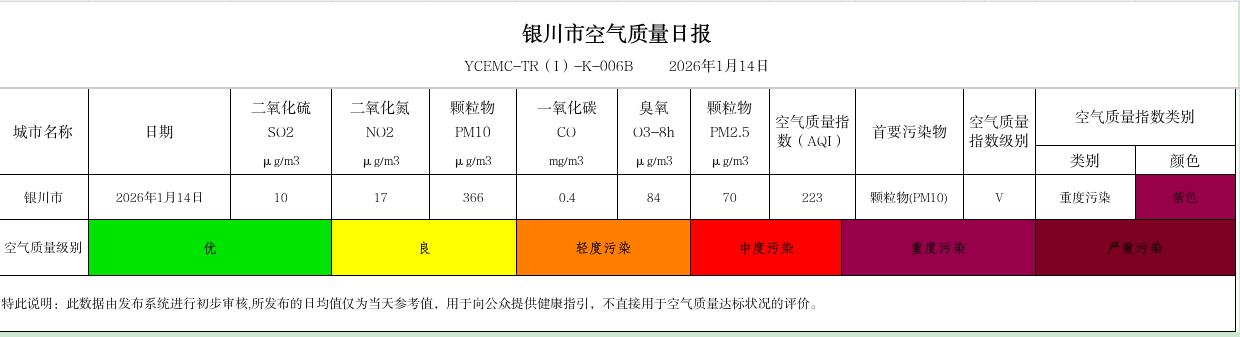 2026年1月14日银川市环境空气质量指数(AQI)为223,五级,重度污染,首要污染物为颗粒物(PM10),PM10浓度为366μg/m3。