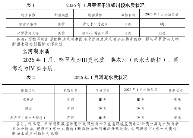 2026年1月,黄河银古公路桥为І类水质,平罗黄河大桥为ІІІ类水质。