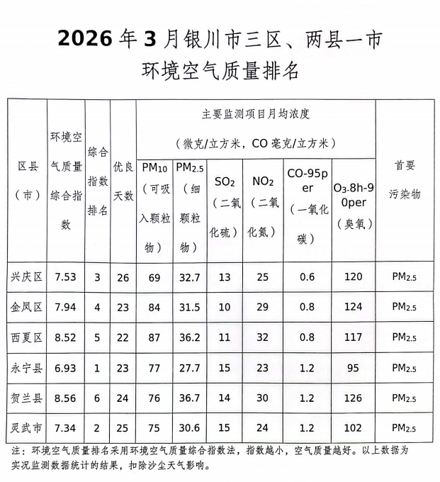 2026年3月银川市三区、两县一市环境空气质量排名