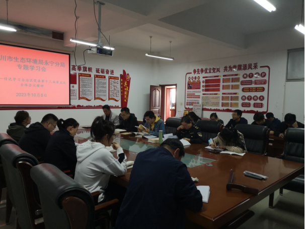 2023年10月8日,银川市生态环境局永宁分局召开专题学习会议,全面传达学习自治区党委十三届五次全会精神,安排部署有关贯彻落实工作,全体干部职工参加会议。