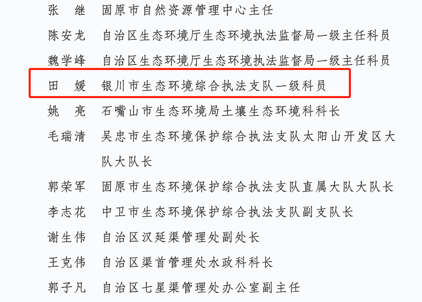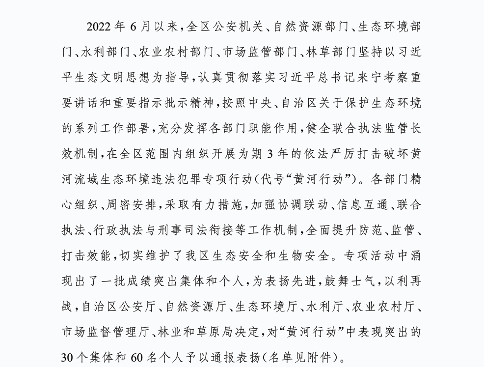 近日,自治区公安厅、自然资源厅、生态环境厅、水利厅、农业农村厅、市场监督管理厅、林业和草原局联合下发《关于对“全区依法严厉打击破坏黄河流域生态环境违法犯罪专项行动”成绩突出集体和个人予以表扬的通报》〔宁公(森)通〔2025〕1号〕,银川市生态环境局获得“黄河行动”成绩突出集体、银川市生态环境综合执法支队一级科员田媛获得“黄河行动”成绩突出个人。