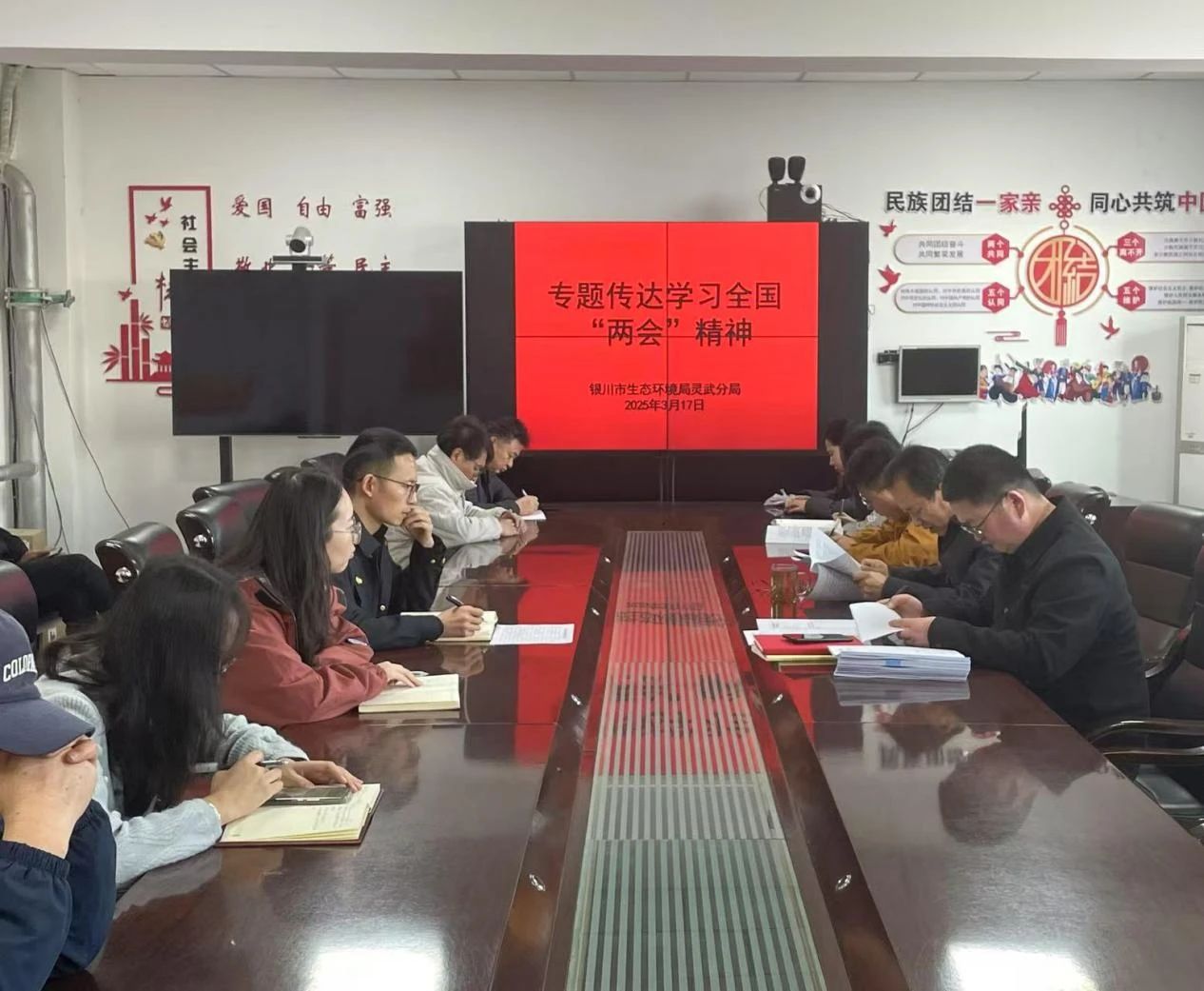 3月17日上午,银川市生态环境局灵武分局召开干部职工理论学习会议,专题传达学习第十四届全国人民代表大会第三次会议和全国政协十四届三次会议精神,安排部署贯彻落实工作,全体干部职工参加会议。