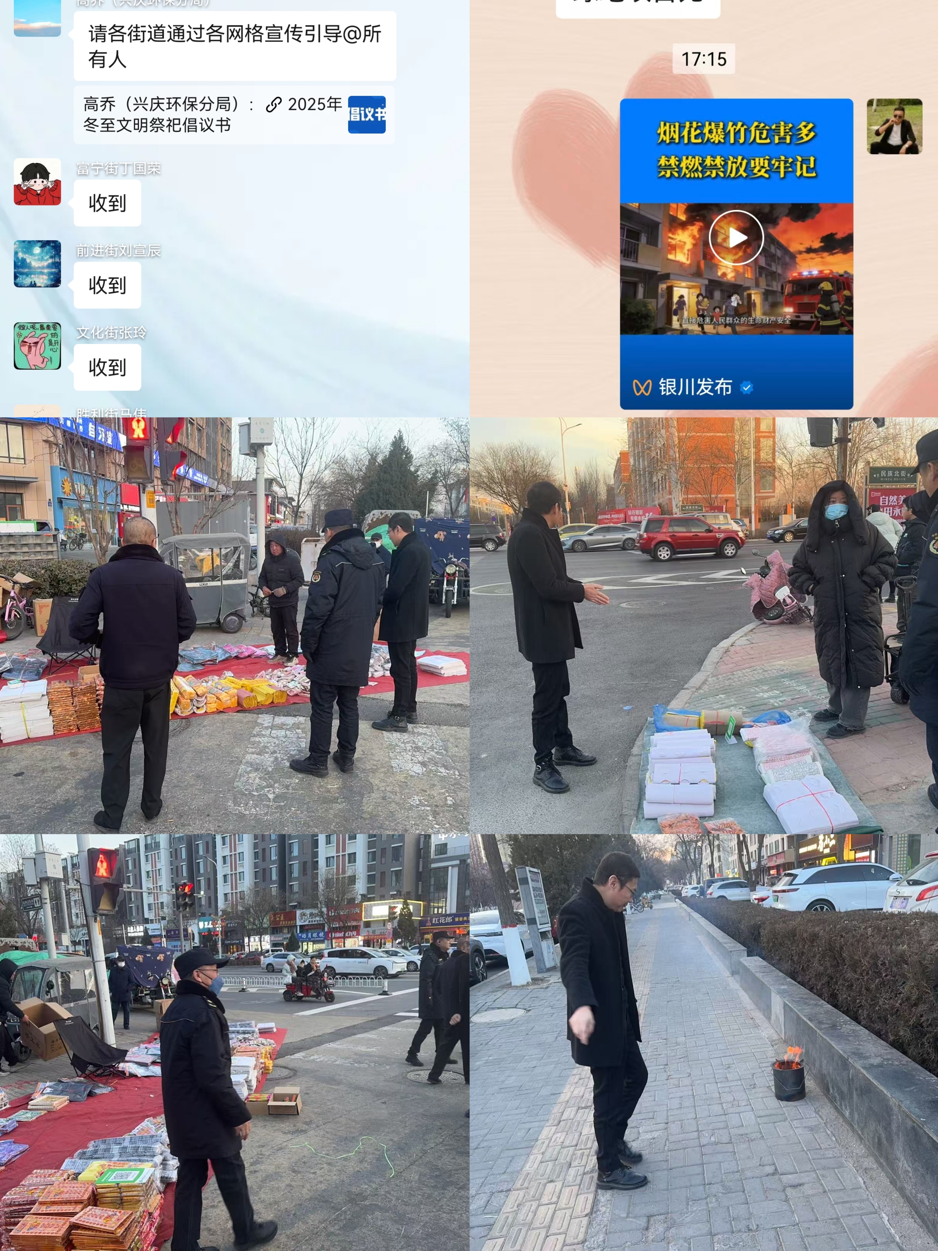 12月21日,兴庆区委生态文明建设领导小组办公室组织街道、综合执法等部门对重点区域文明祭祀进行检查劝导,通过划定祭祀点,放置祭祀桶等方式引导群众文明、绿色祭祀,防止集中祭祀导致大气污染。对海宝公园周边进行巡查,疏散售卖香纸等摊贩,强化公园内私卖小花炮等摊贩监管,组织转发烟花爆竹燃放危害宣传视频,加强烟花爆竹禁放宣传。持续开展散煤排查整治,安排对重点区域进行突击夜查,严格管控携带高污染燃料的流动摊贩。