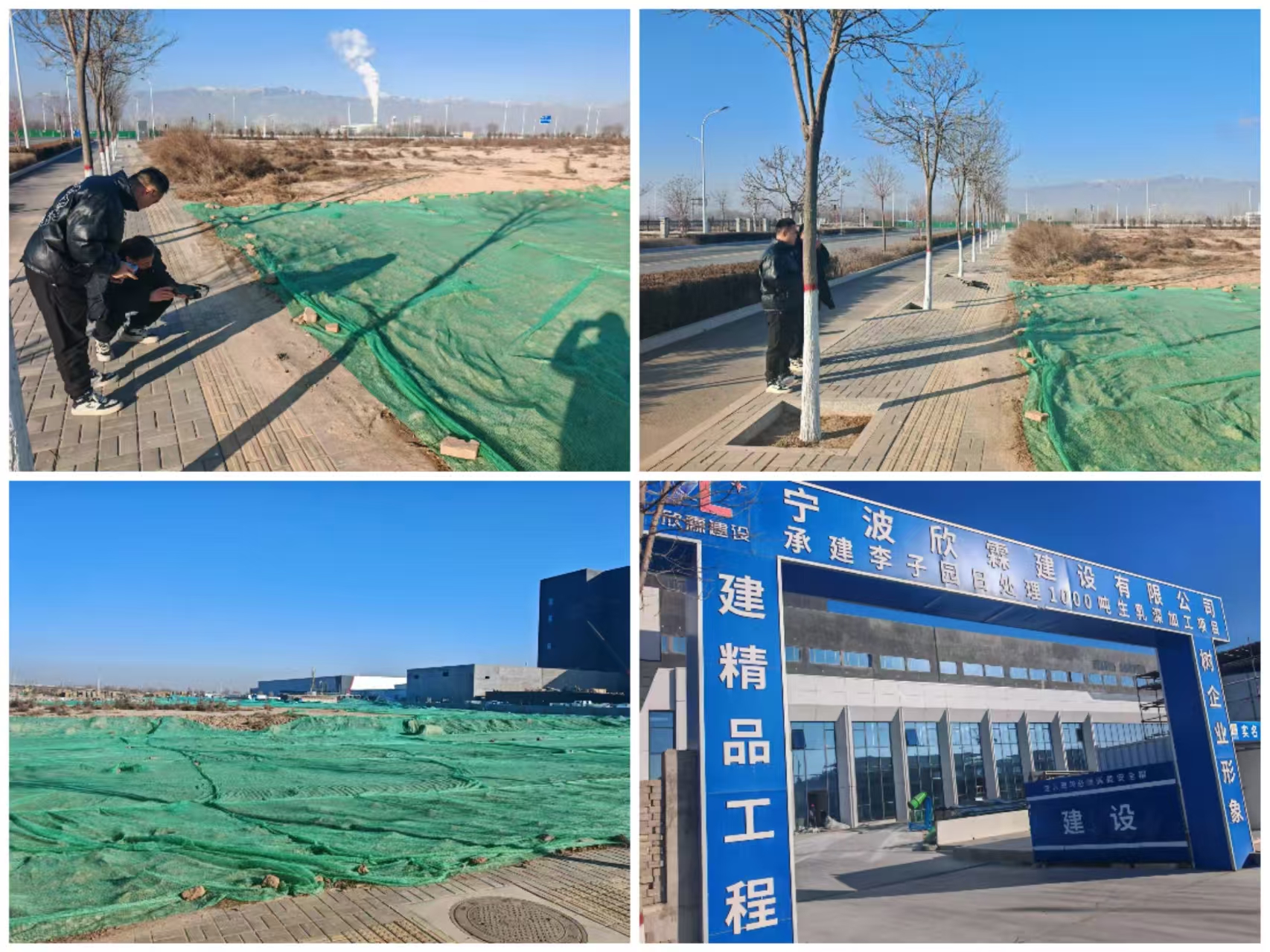 1月8日,灵武分局组织人员对灵武市智能化乳品加工生产基地 EPC 总承包建设项目进行检查,现场设置定点无人机巡查,施工方已对前期反馈的问题进行整改,要求施工方对裸露堆土进行苫盖,及时清扫路面灰尘,减少扬尘污染。
