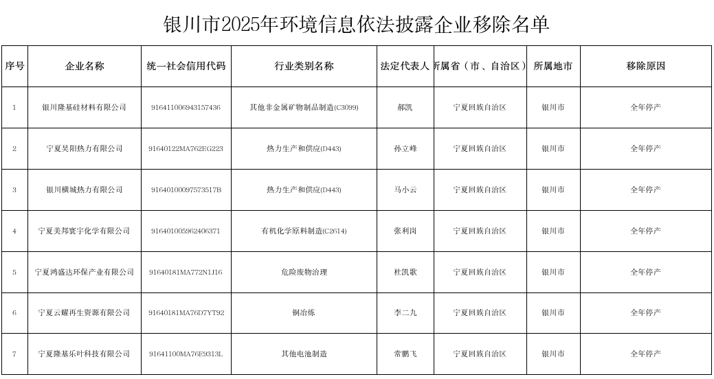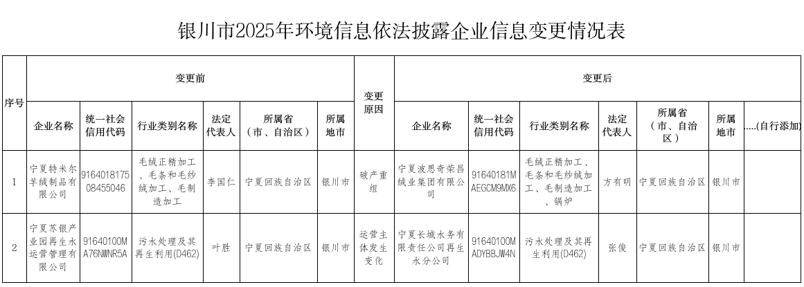 根据生态环境部《企业环境信息依法披露管理办法》相关规定和自治区生态环境厅相关要求,现将银川市2025年度环境信息依法披露企业名单变更情况予以公示。此次变更情况为:7家企业移出名单、2家企业变更企业信息,变更后纳入2025年度环境信息依法披露企业名单共114家。