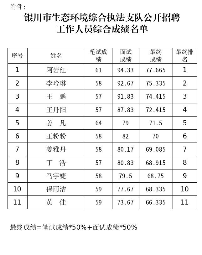 根据《银川市生态环境综合执法支队公开招聘工作人员公告》及招聘工作相关规定,经过报名、资格初审、笔试、资格复审、面试环节,现将本次招聘综合成绩予以公示。